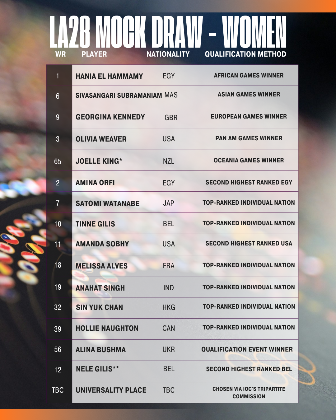Joelle King* - Joelle King is currently the highest ranked female in Oceania at 65 in the world. If she was not to be ranked inside the Top 50 come May 2028, she would not travel to LA. Instead her place in the draw would be offered to the silver, or if necessary, bronze, medal winner at the Oceania Games - providing they are ranked inside the top 50. If neither is ranked Top 50, the place in the draw would then be offered to the next highest ranked indivudal in the World Rankings from a unique nation (Alina Bushma in this case)